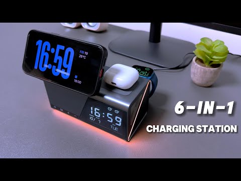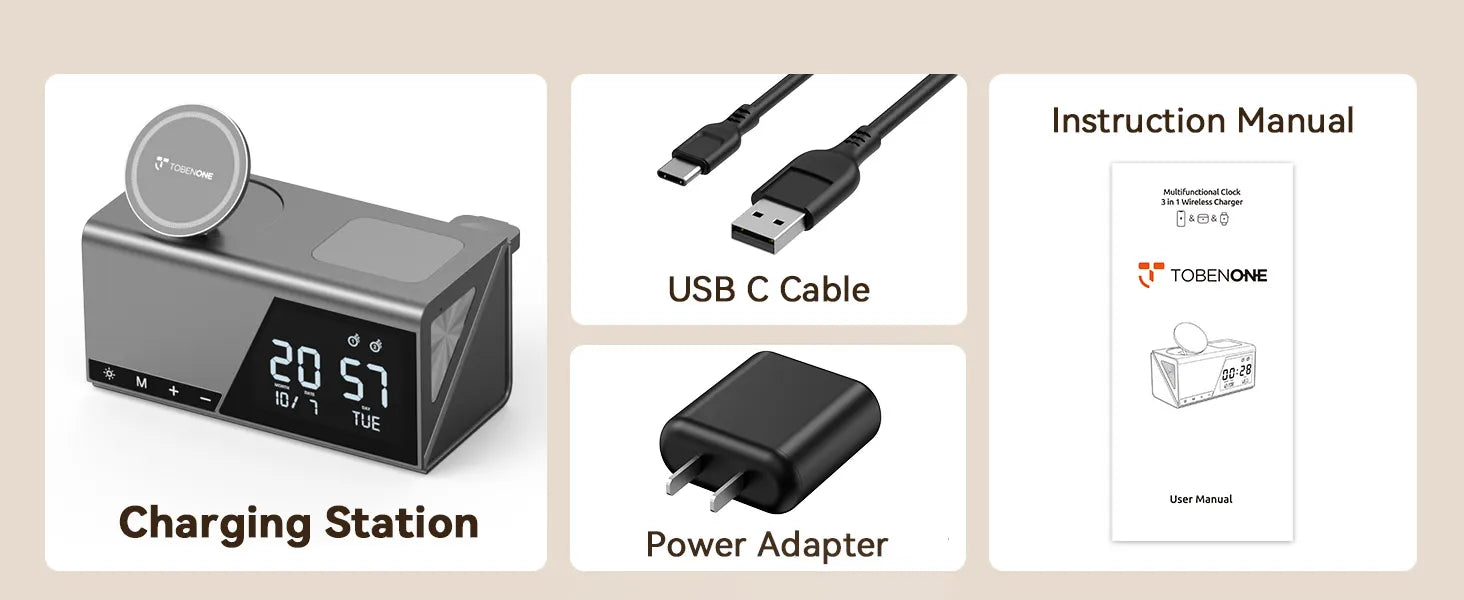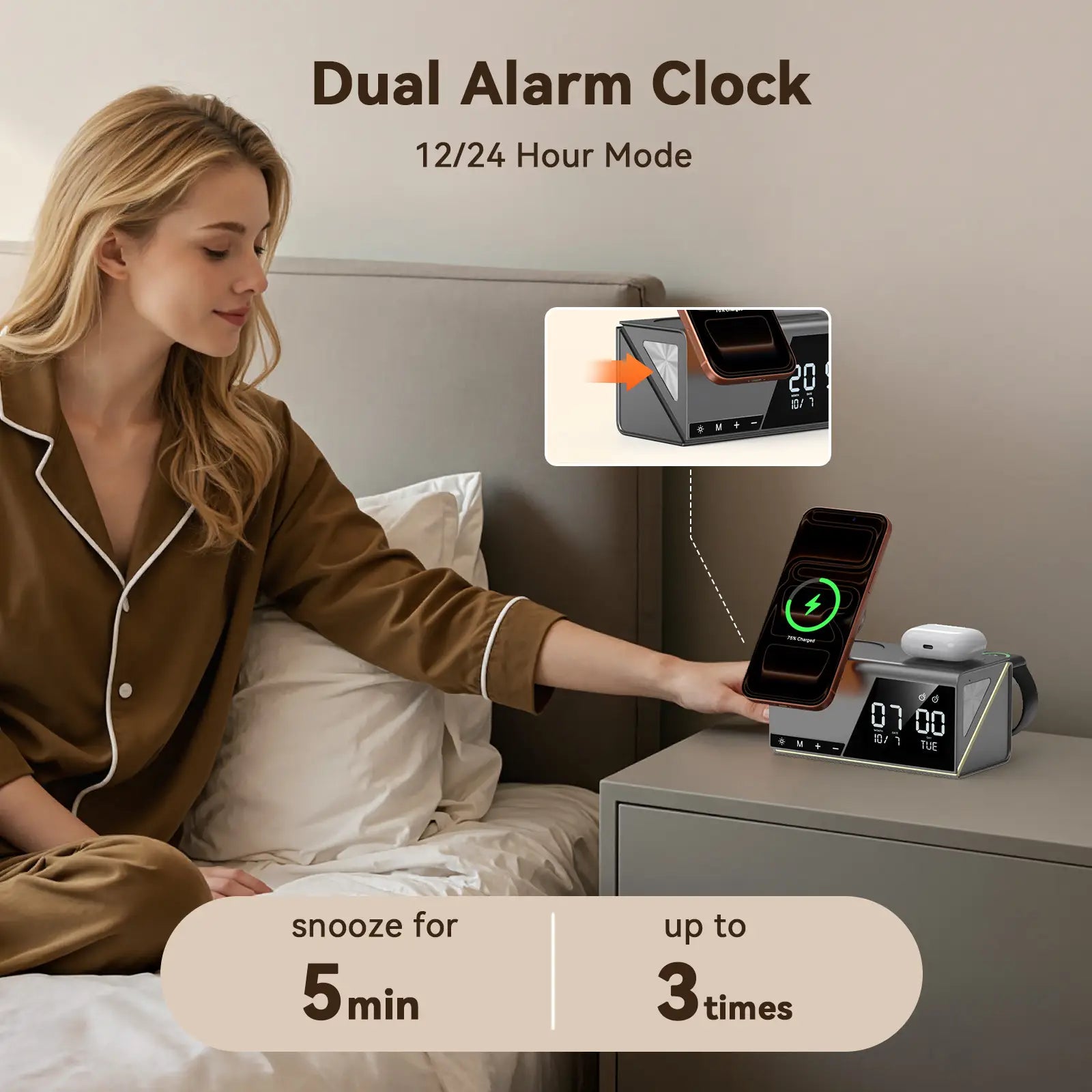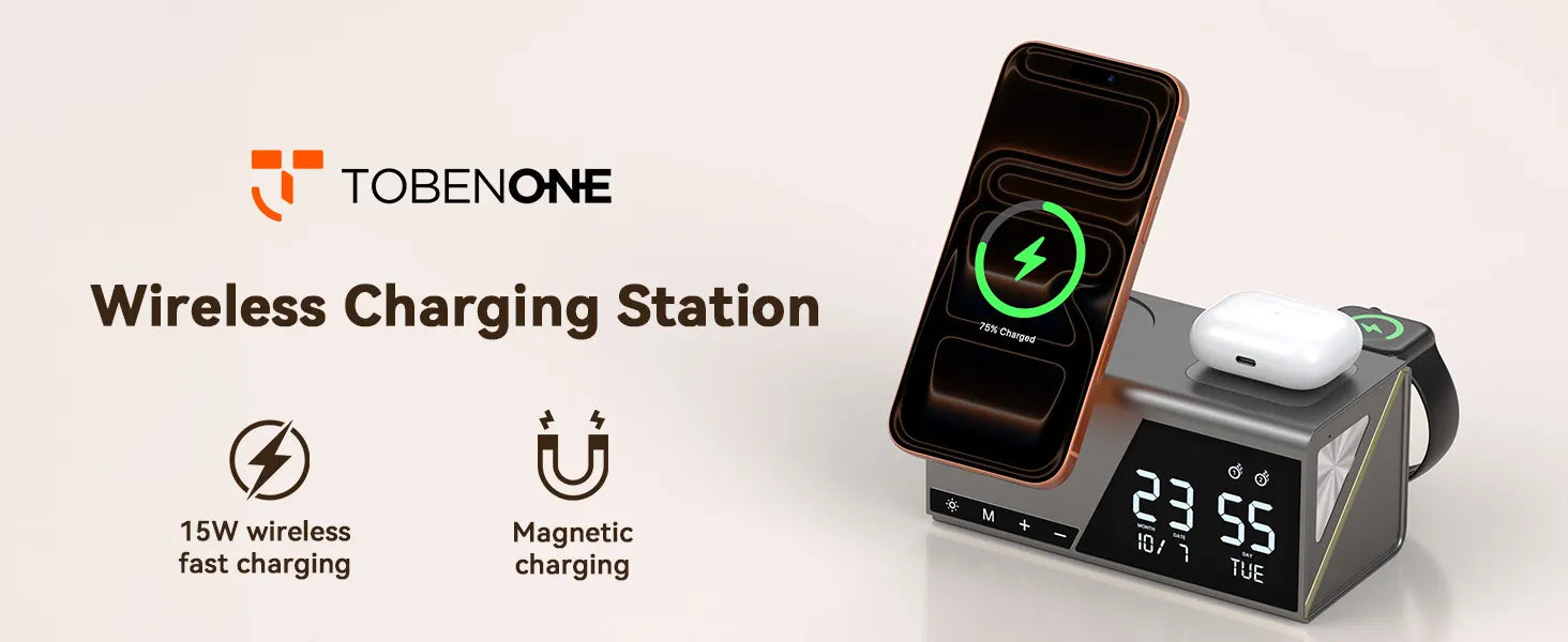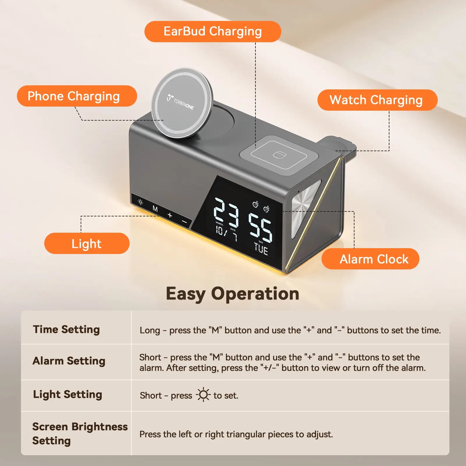 TobenONE 6-in-1 Wireless Charging Station with Alarm & Night Light & MagSafe Magnetic Phone Charger for Apple Devices TCW01