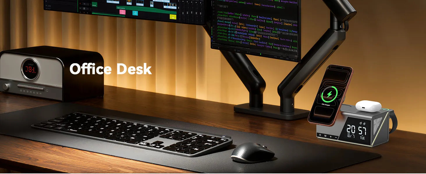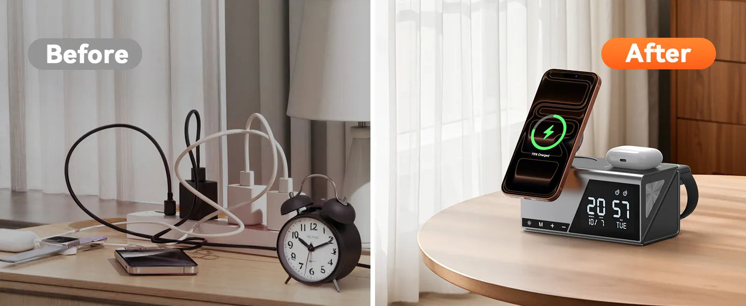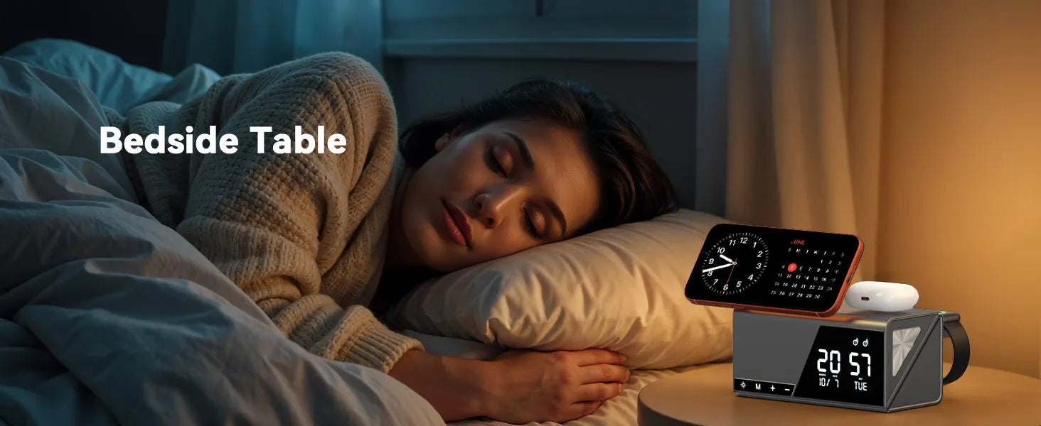 • Adjustable Night Light and Display Brightness: This apple charging station with clock is equipped with multiple brightness settings, helping you create an ideal atmosphere and prevent strong light from disturbing your sleep. The dimmable night - light function is a perfect substitute for a bedside lamp. When night falls, it emits a soft glow beside your bed, making it convenient for you to check the charging status of your devices or see the time at night.