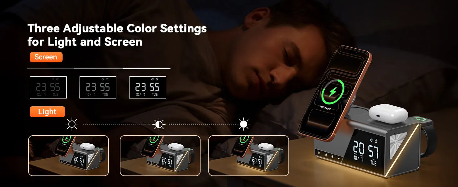 • All-in-one Wireless Charging Station: The wireless iphone charging station is equipped with a digital alarm clock and adjustable night light functions. It supports simultaneous charging of multiple devices such as iPhones, AirPods and Apple Watches. This alarm clock with wireless charging can eliminate cable clutter and keep your desk or nightstand tidy.