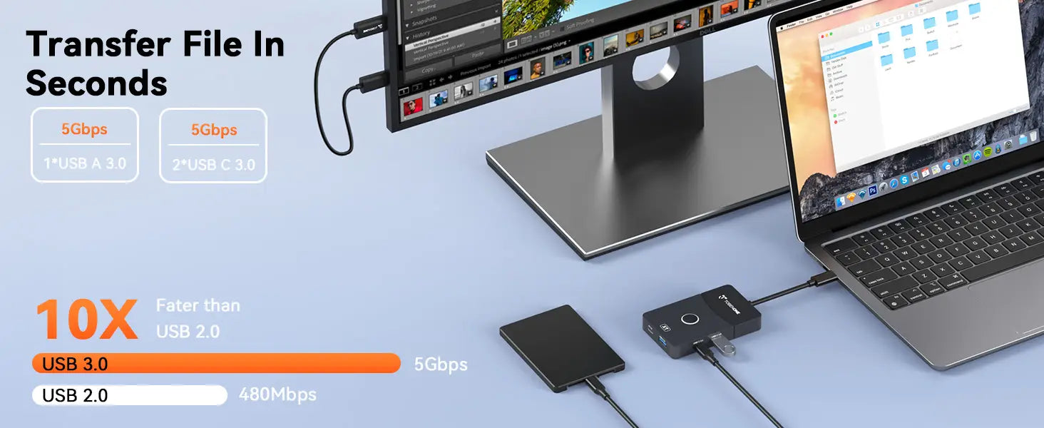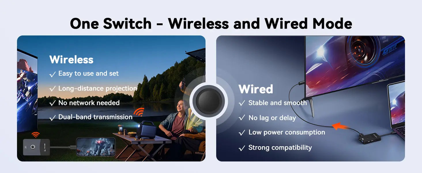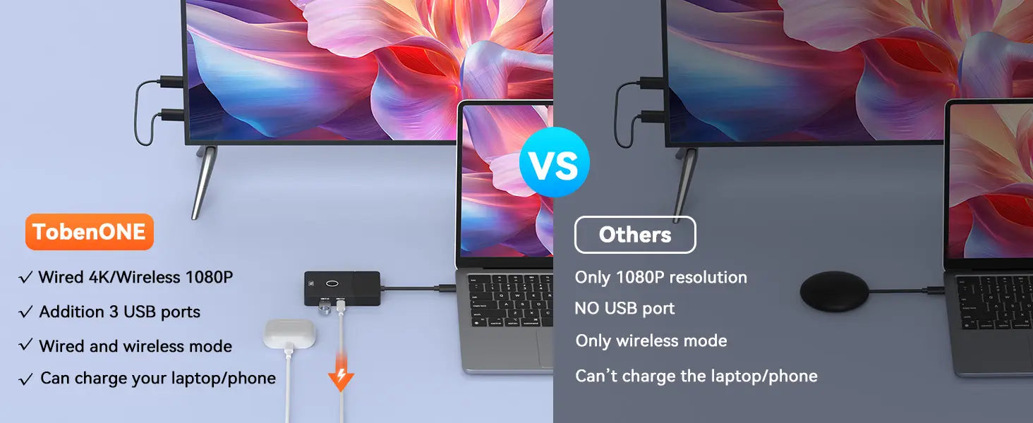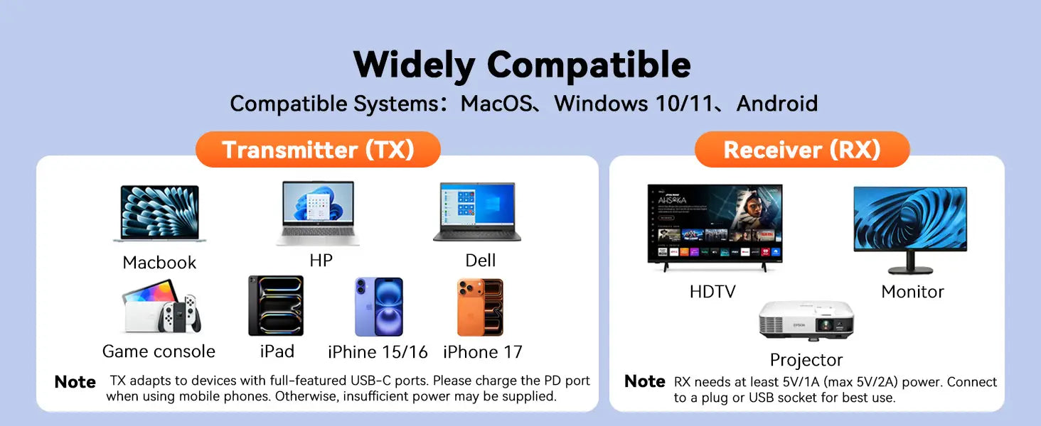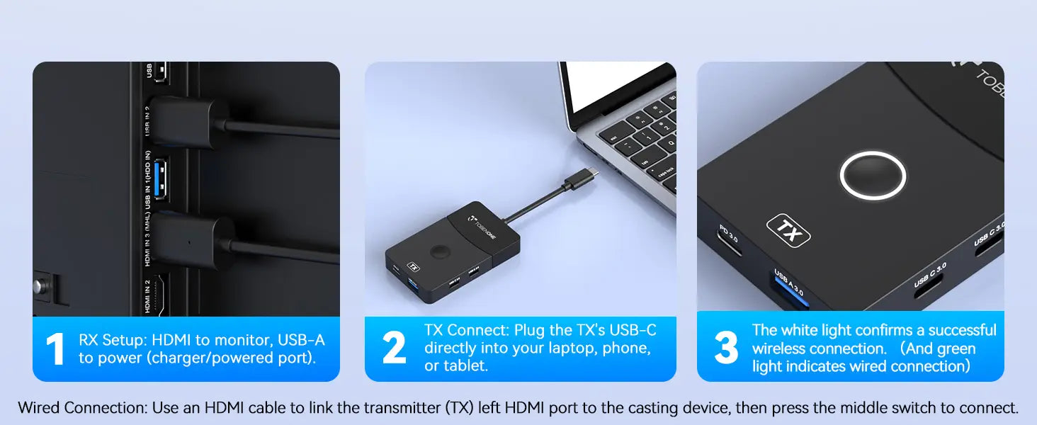When the USB-C port of your laptop/phone/tablet is plugged into the transmitter, you can also use the PD3.0 port on the transmitter to connect to the charger to charge your device.