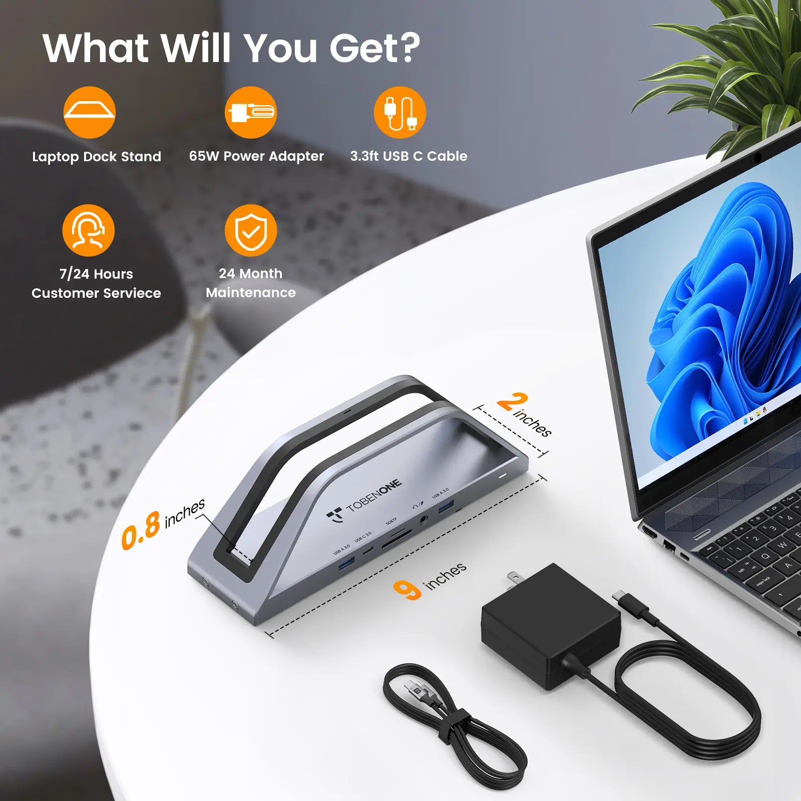 What Will You Get: With the TobenONE USB C dock, you will get a 14 IN 1 vertical docking station stand, 65W power adapter, 1x 3.3ft USB C cable, 24-month warranty, and friendly customer service.