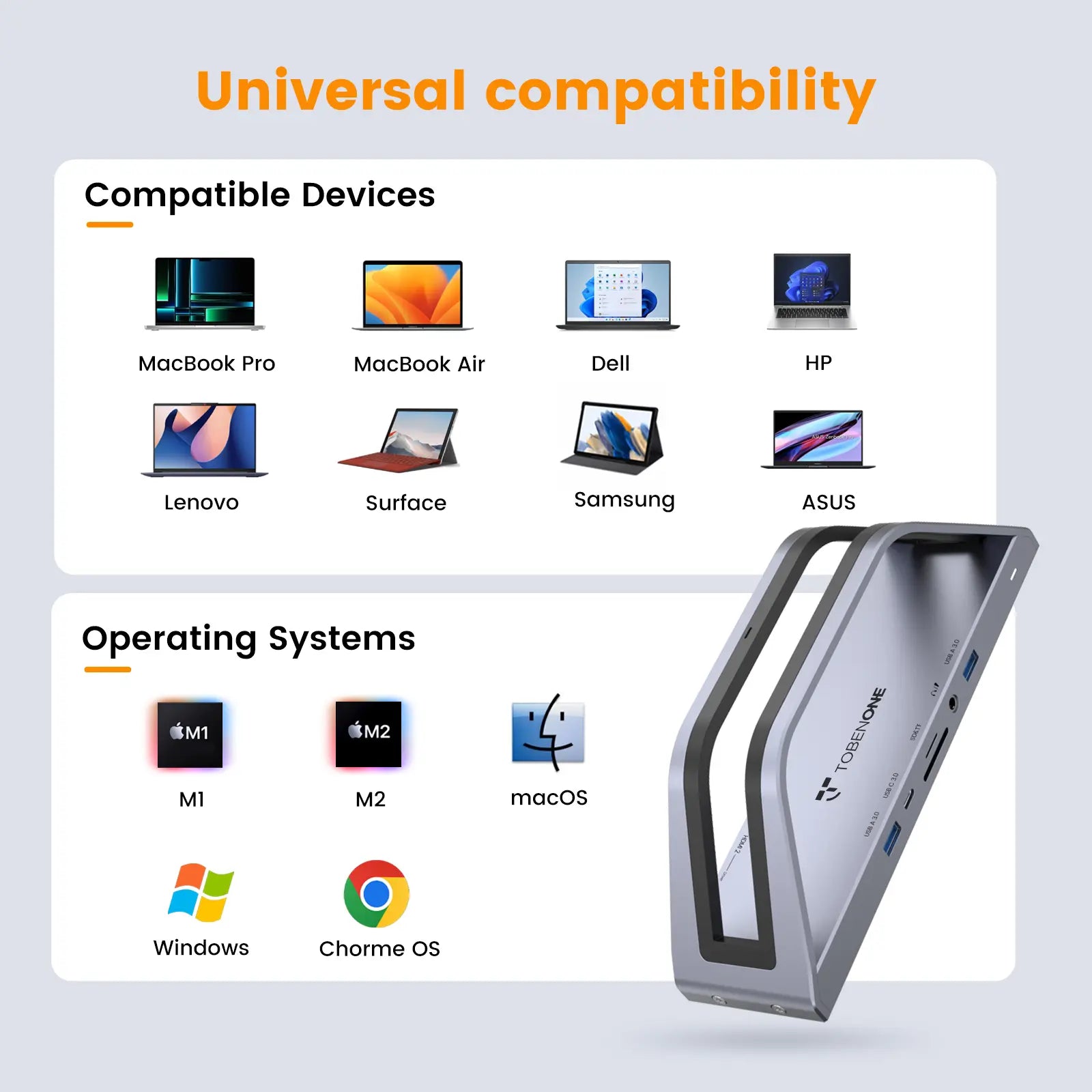 Laptop Docking Station with Vertical Stand: This USB C dock dual HDMI hub is a new innovation and design carried out by the TobenONE team according to market demand: combining the docking station and laptop stand. Not only can it extend up to triple monitors for your USB-C Windows and MacBook laptop, but it can also be used as a stand to save your desktop space and improve your work efficiency.