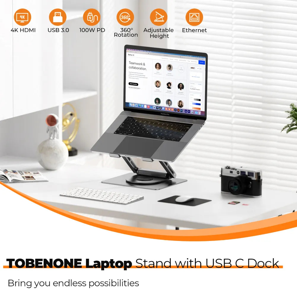 Multi-Function 4K Docking Station: This TobenONE laptop hub docking station combines the functions of the laptop dock and laptop stand. You can easily fulfill your daily use by extending one USB C port of your laptop to 6 ports via this HDMI docking station, Including HDMI port support for 4K@60Hz, PD charging port, a host port to connect the laptop, 2 USB 3.0, and Gigabit Ethernet RJ45 ports.