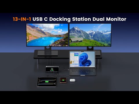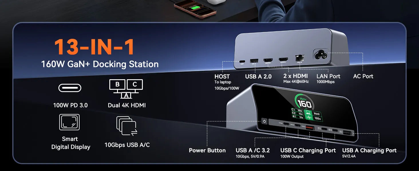 • 13-IN-1 Power Solution for Multi-Device Users: This laptop docking station is equipped with 2 HDMI ports, 2 USB C port and USB-A ports up to 10Gbps, USB-A 2.0 port for additional connectivity, Max Output 160W 3 USB-C and 1 USB-A PD port, Gigabit Ethernet, AC Port and Button press. Used to charge laptops, tablets, and phones simultaneously, no bulky power adapters needed! Perfect for remote workers, students, or anyone juggling multiple gadgets, solving the hassle of scattered chargers