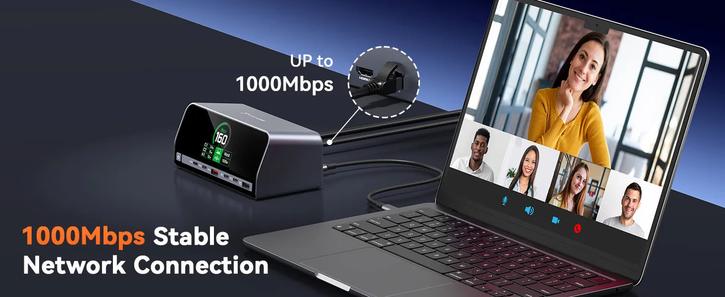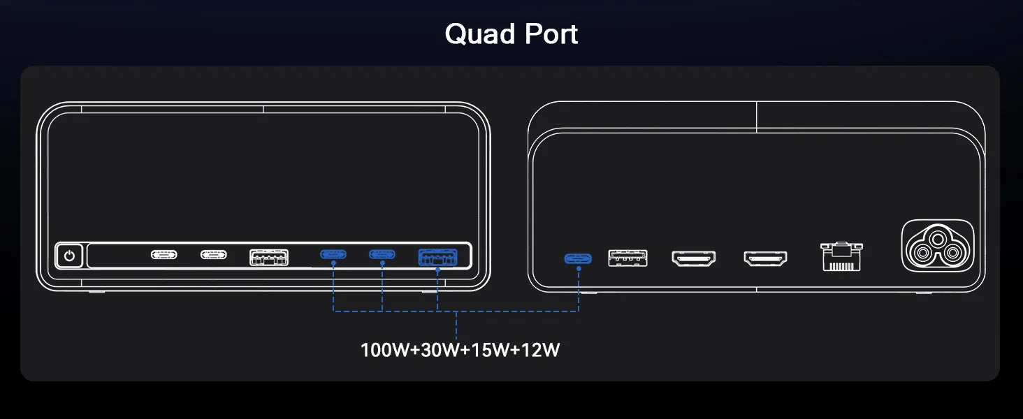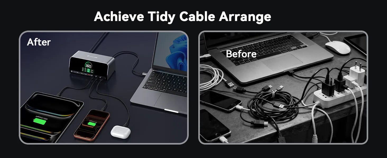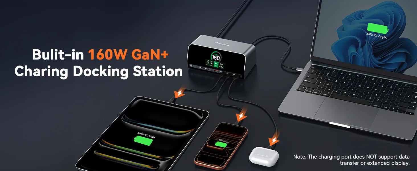 • 160W GaN+ Smart Power Distribution: This laptop charging docking station is powered by GaN+ technology, delivers 160W total power with USB A/C PD 3.0 (100W max). The intelligent power system is capable of balancing power across 4 devices automatically. Used for stable, efficient charging in home workstations, shared office setups, or business travel. It’s ideal for professionals, frequent travelers, or families sharing devices, eliminating worries about uneven power allocation