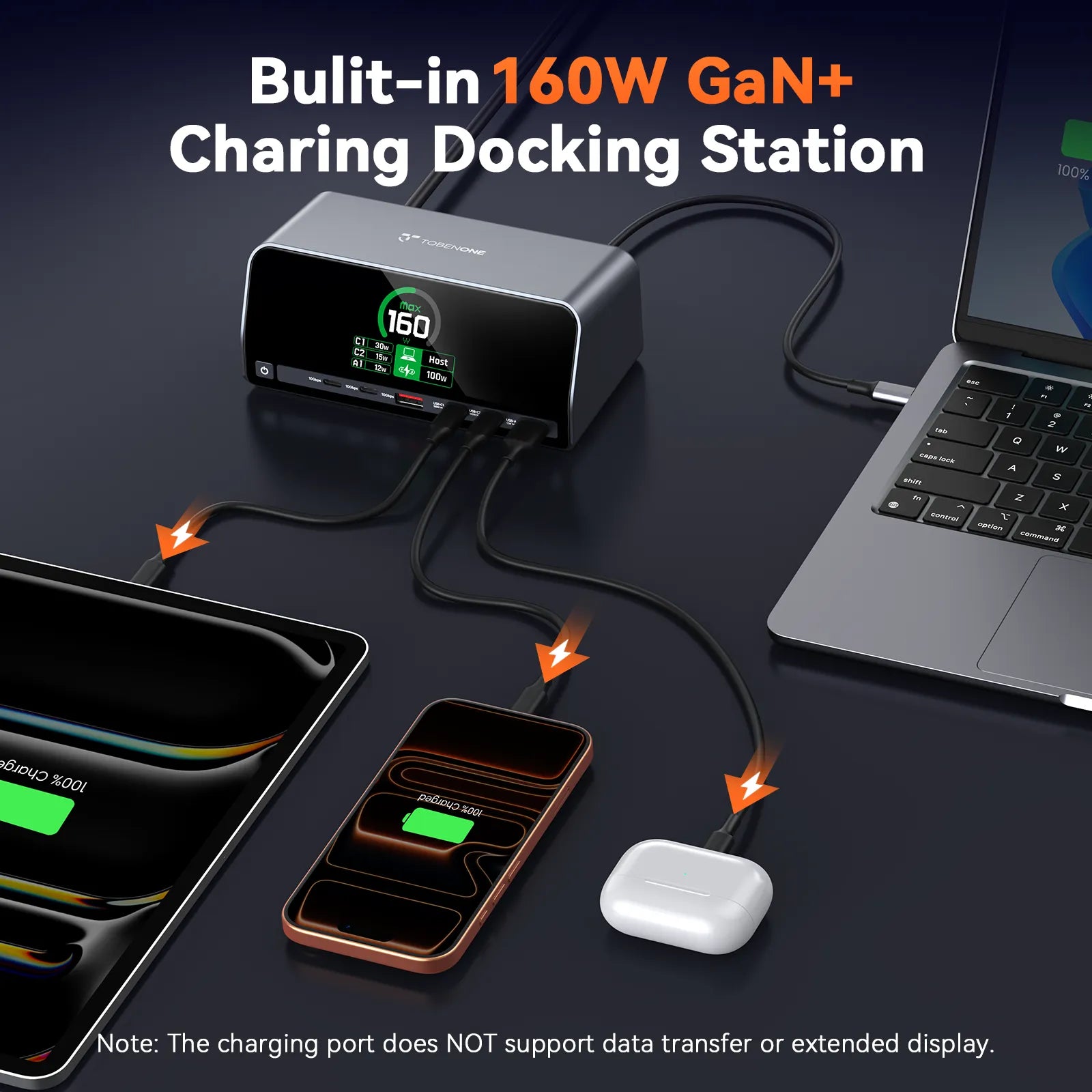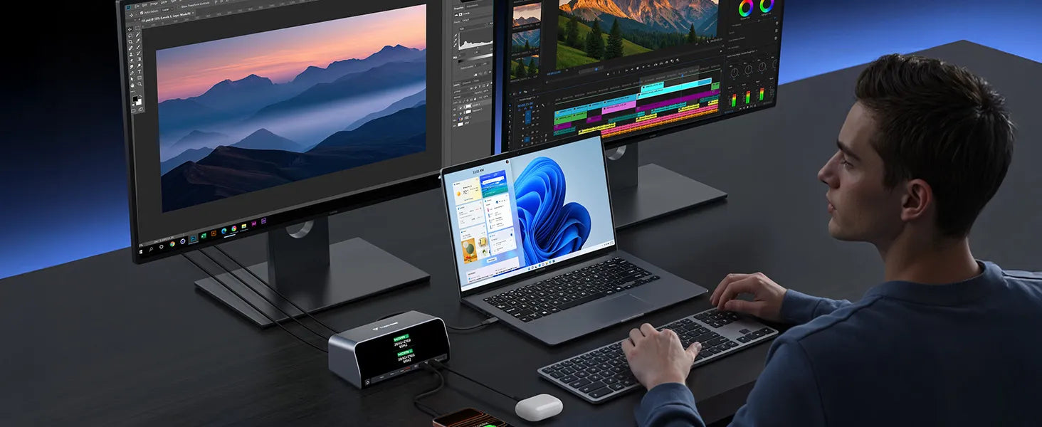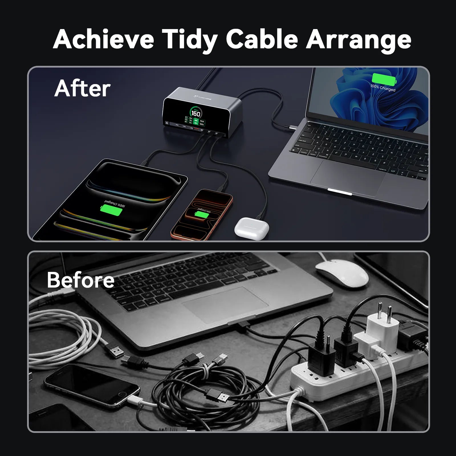 • 160W GaN+ Smart Power Distribution: This laptop charging docking station is powered by GaN+ technology, delivers 160W total power with USB A/C PD 3.0 (100W max). The intelligent power system is capable of balancing power across 4 devices automatically. Used for stable, efficient charging in home workstations, shared office setups, or business travel. It’s ideal for professionals, frequent travelers, or families sharing devices, eliminating worries about uneven power allocation