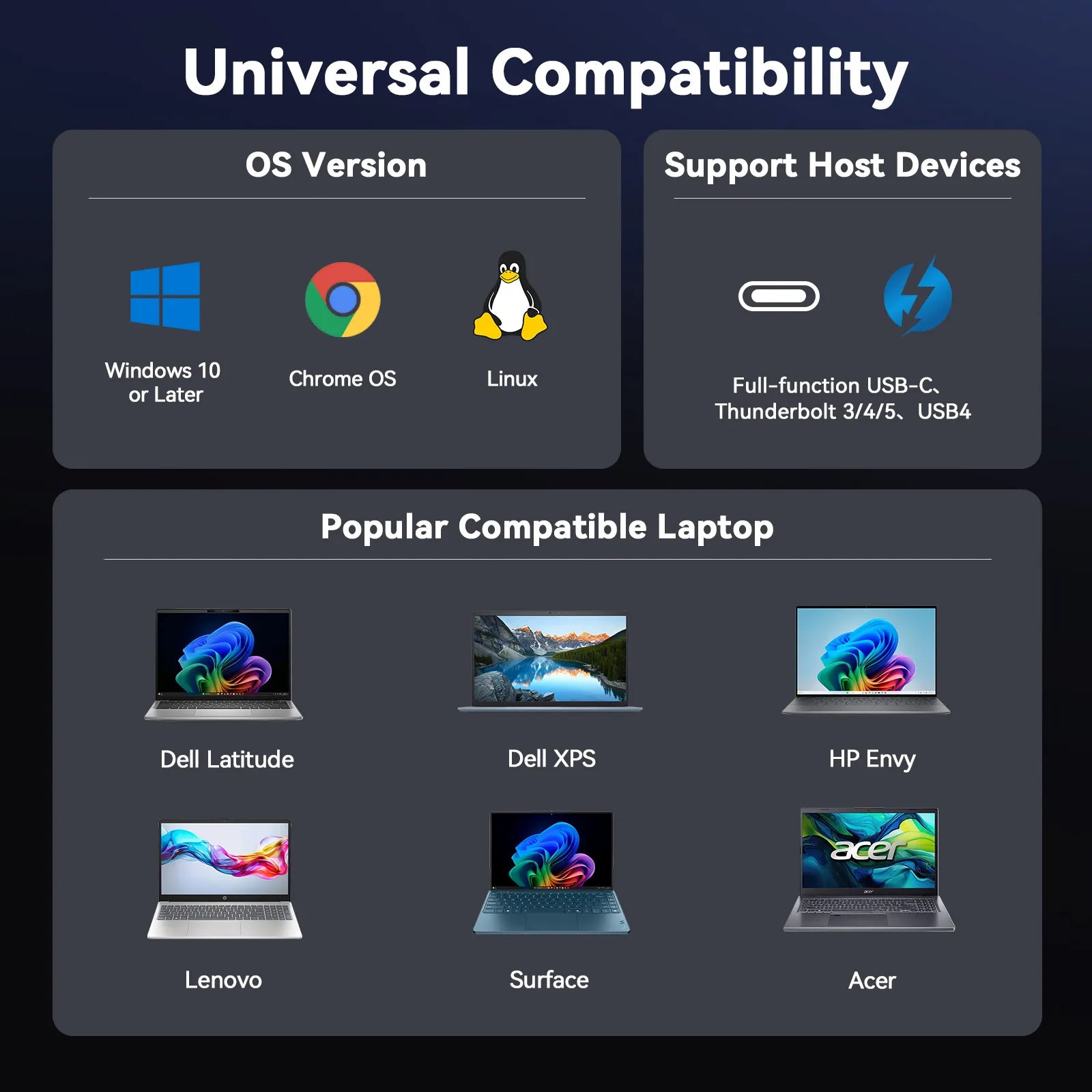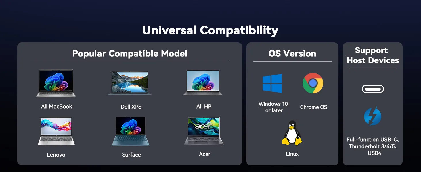 Supports full-featured USB-C, USB4, and Thunderbolt 3 / Thunderbolt 4 systems running Windows 10 / 11 & ChromeOS 100 or newer including, HP ProBook / EliteBook / Spectre x360 series, Dell XPS / Latitude / Inspiron series, Lenovo ThinkPad / IdeaPad / Yoga , Microsoft Surface Pro / Go / Book / Laptop models, LG Gram, Thousands of other laptops which are compliant with full-featured, standards-compliant USB-C ports