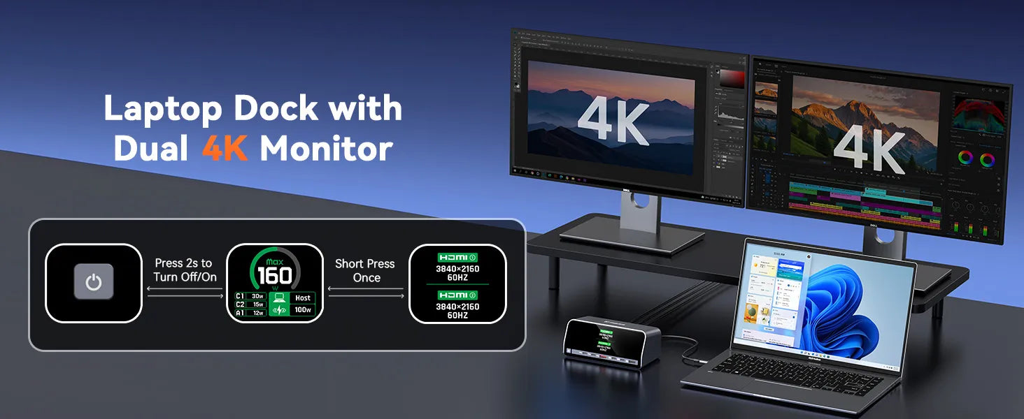 • Immersive Dual 4K Display for Work & Entertainment: This USB C docking station dual monitor is capable of delivering crystal-clear dual 4K@60Hz visuals via two HDMI ports. Used as a multi-screen solution for designers, gamers, or office workers, it lets you instantly monitor resolution/refresh rate via a dedicated button—used to achieve seamless, sharp displays for work or play