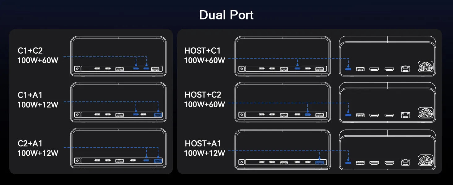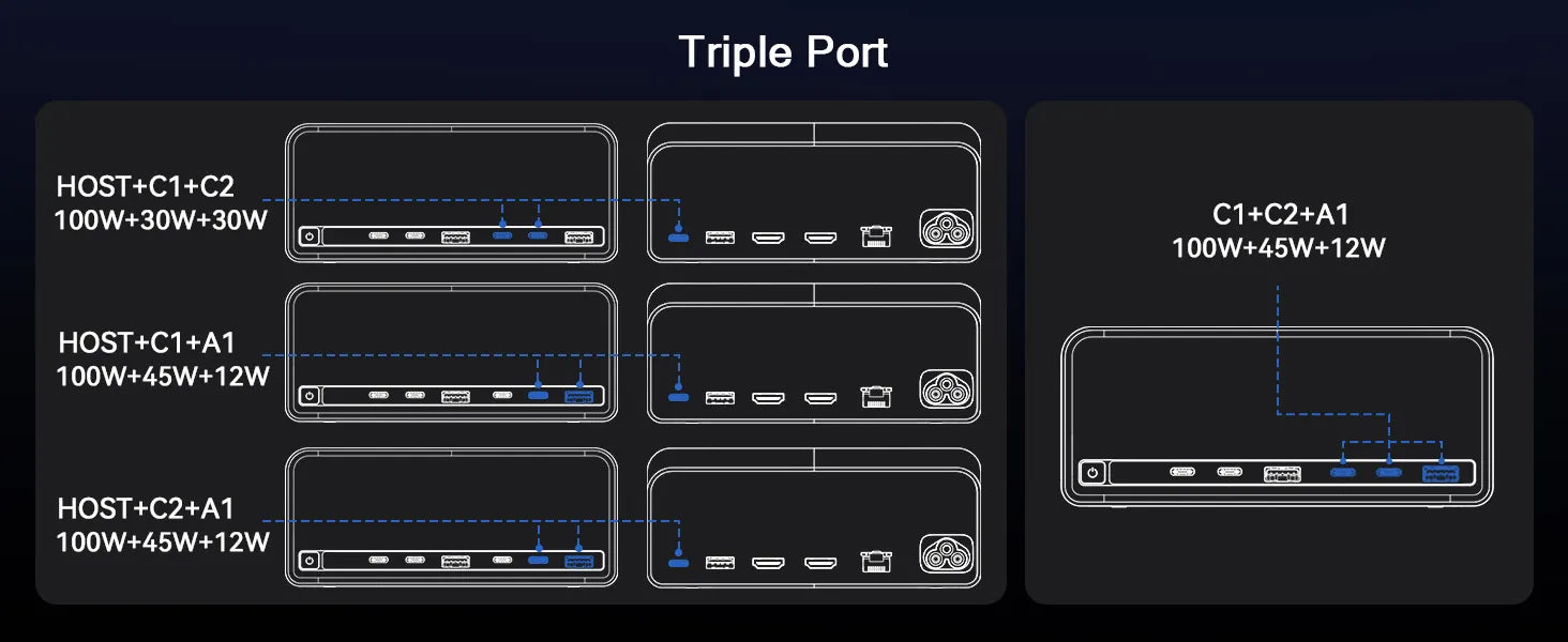 power is as follows: HOST (100W) + USB-C1 port (30W) + USB-C2