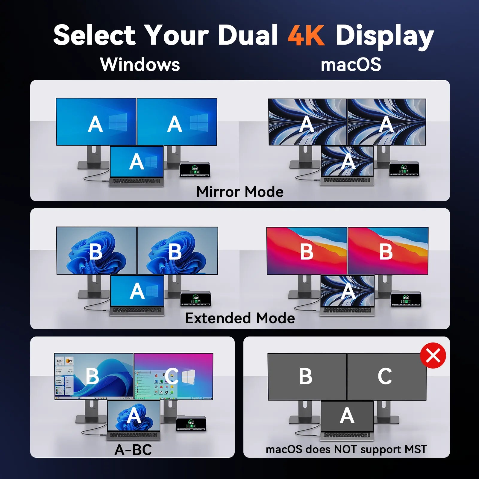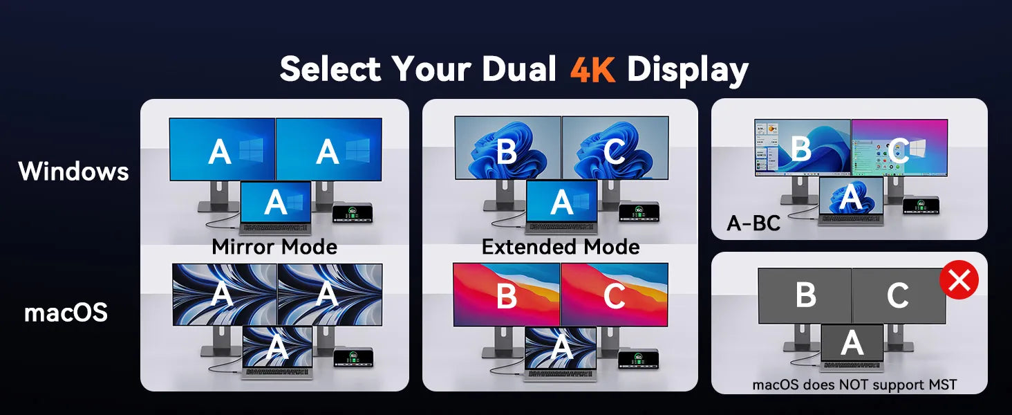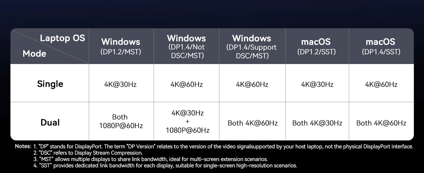 • Note 5: Mac systems do not support MST. So Apple laptops do not suppport dual-screen expansion through this dock.
