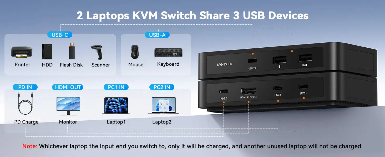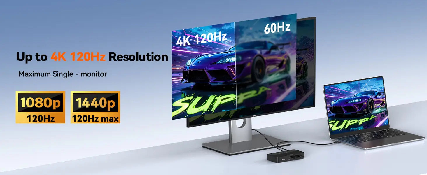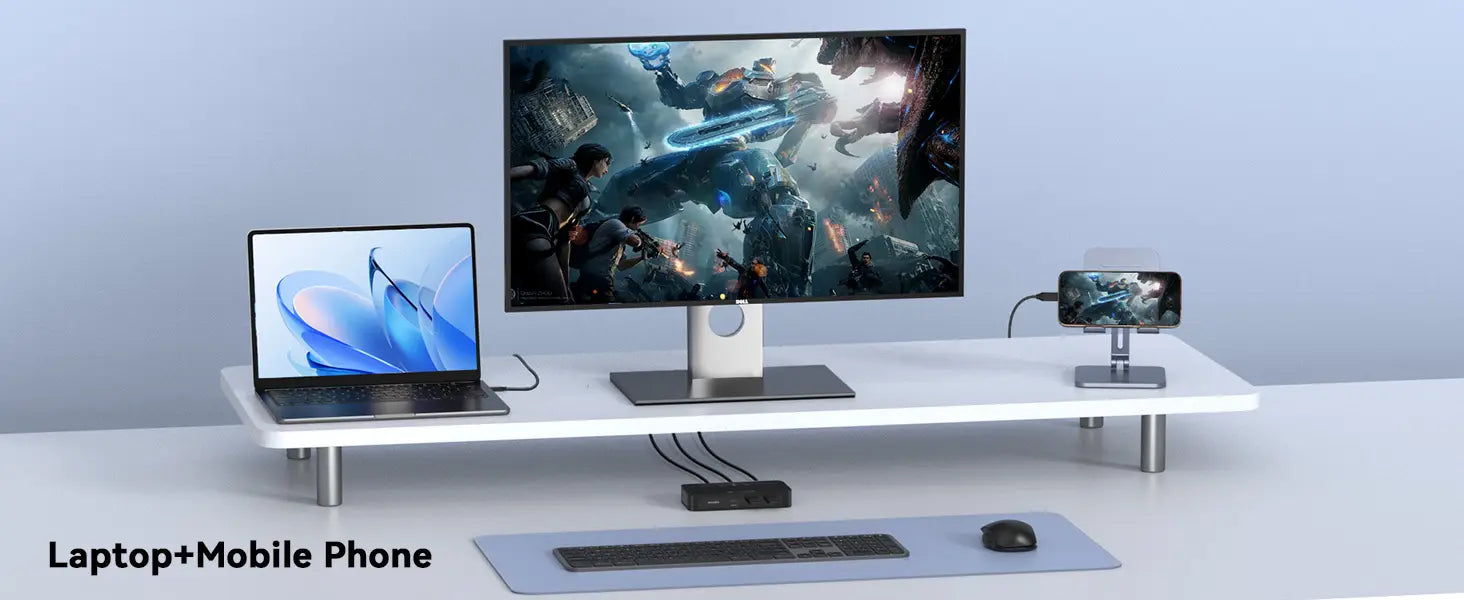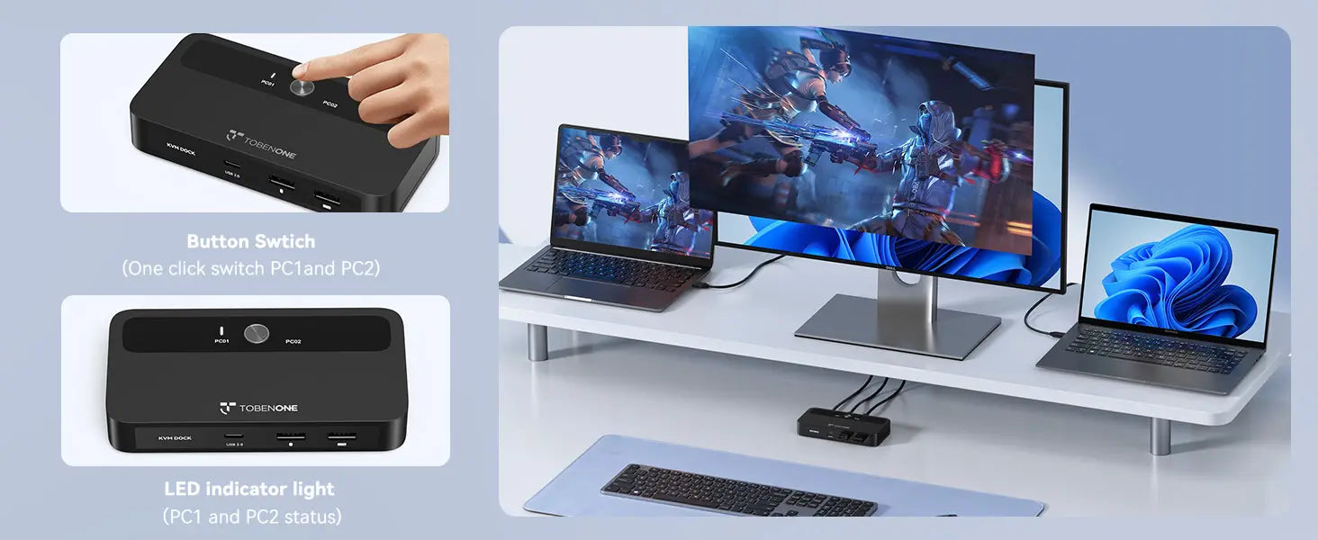• Ultra HD 4K@120Hz Visual Enjoyment: This 2 computers 1 monitor switch can support resolutions up to 4K@120Hz, 2K@120Hz, 1080P@120Hz, make image display more exquisite and realistic, color is more bright and moving. Of course, it also supports 4K@60HZ. Note: To achieve 4K@120Hz, it is necessary that your laptop's usb-c port, the cable connecting the dock and the laptop, and the monitor all support 4k@120Hz. Perfect for Gamers, office workers, and anyone seeking to streamline their desktop setup, enhance multi-device collaboration efficiency.