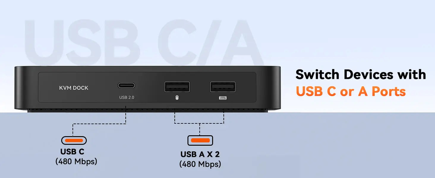 • Three USB 2.0 Ports: The USB C KVM Switch is equipped with two USB A 2.0 ports and one USB C 2.0 port, which can connect mouse, keyboard, printer, hard disk or other USB devices. USB 2.0 ports support 480Mbps data transfer rate, making it easy to move files and photos. Ports PC01 and PC02 are only designed for connecting laptops and do not support functions such as data transfer, video transmission, or charging.