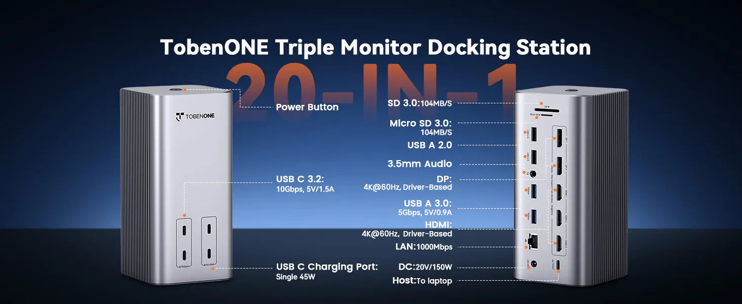 • 20-in-1 Triple Monitor Docking Station: This USB C docking station is equipped with 2*10Gbps USB-C ports, 2*PD 45W USB-C charging ports, 3*HDMI ports, 2*DP ports, 2*5Gbps USB-A ports, 2*USB 2.0 ports, RJ45, 3.5mm audio, SD/micro SD card slot, Host, button, and 150W DC to minimize cable clutter and extend product functionality. Connect your laptop to displays, peripherals, and networks with just one USB-C cable for instant productivity boost.