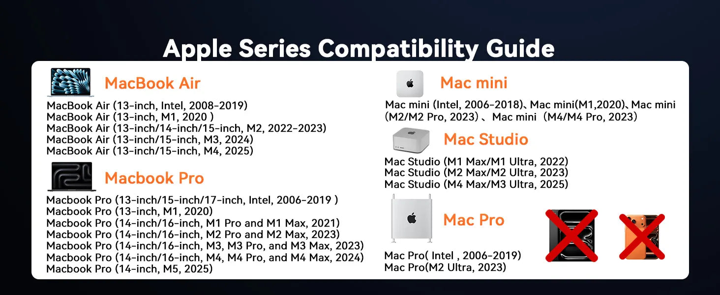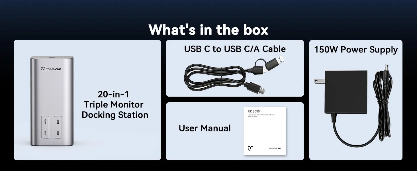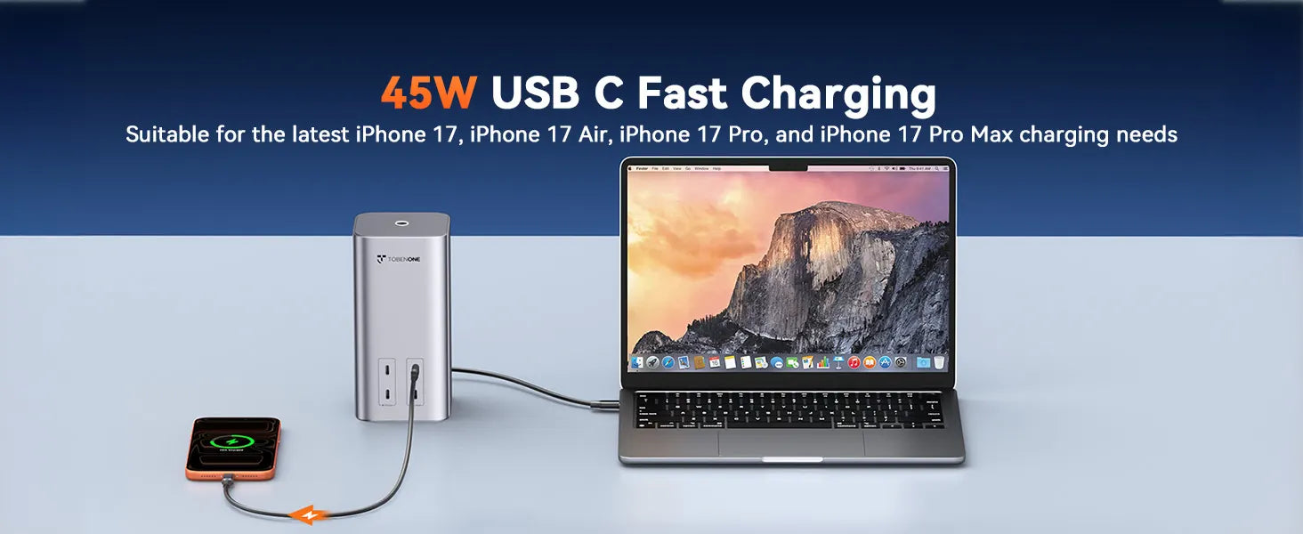 • 150W DC Power Supply & Dual 45W Charging Ports: The MacBook docking station 3 monitors includes a 150W adapter to power the dock itself and provide stable charging for high-wattage laptops (output: 100W). Two USB-C charging ports deliver 45W fast charging for phones/tablets (single port) or 22W*2 (dual ports). Delivers an ultra-fast charging experience, significantly reducing laptop charging time while enhancing multi-device charging convenience. Reminder: This USB-C docking station perfectly meets the charging needs of the entire iPhone 17 series.