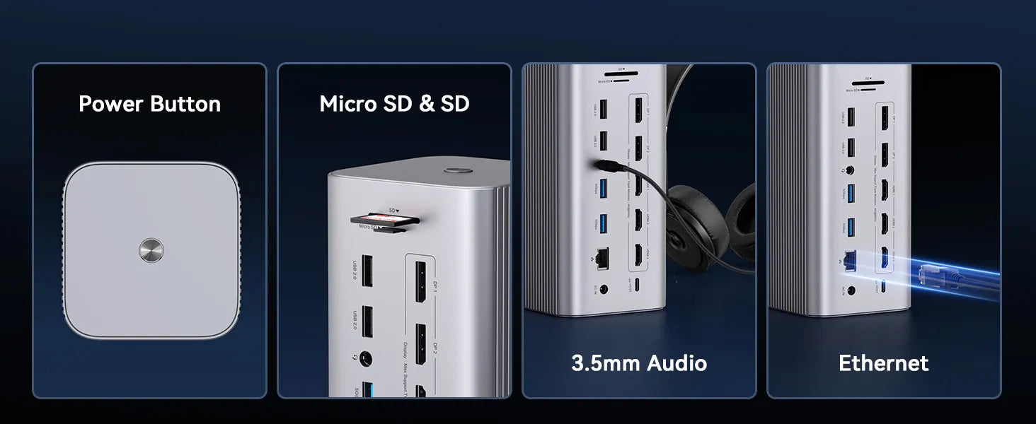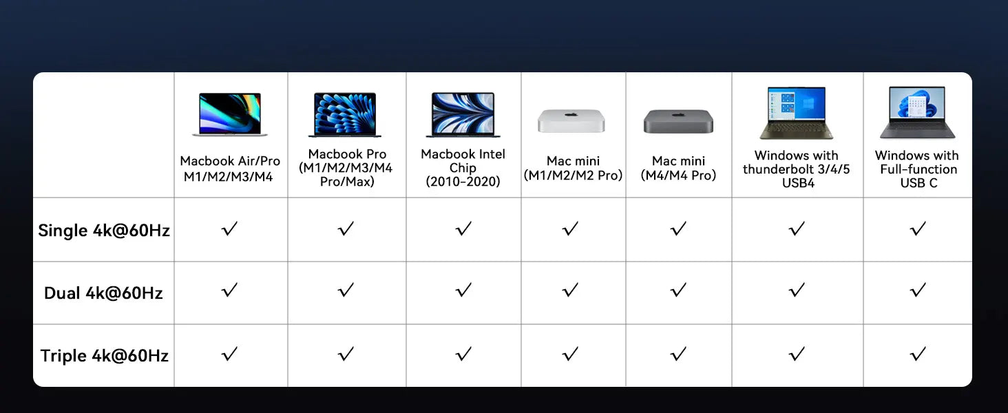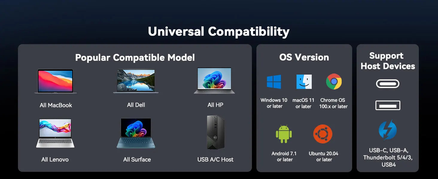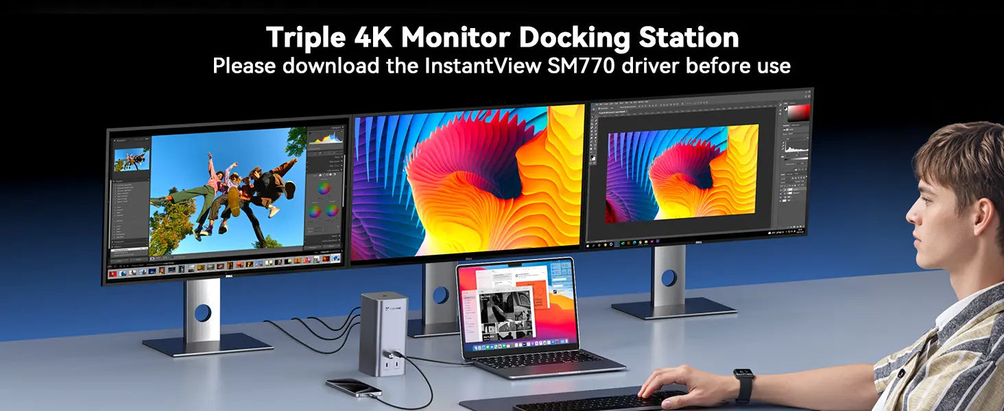 This laptop docking station seamlessly works with Windows (10+), macOS (11+), and Linux systems, as well as full-featured USB-C, Thunderbolt 3/4/5, and USB4 laptops. Includes a USB-C to USB-A adapter for desktop/USB-A devices. Note: Install the latest InstantView SM770 driver before use (Not Plug-and-play). Mac users must authorize screen recording permissions for this driver
