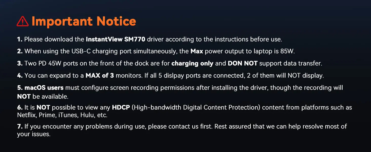 • Extensive Multi-OS and Device Compatibility: This laptop docking station seamlessly works with Windows (10+), macOS (11+), and Linux systems, as well as full-featured USB-C, Thunderbolt 3/4/5, and USB4 laptops. Includes a USB-C to USB-A adapter for desktop/USB-A devices. Note: Install the latest InstantView SM770 driver before use (Not Plug-and-play). Mac users must authorize screen recording permissions for this driver.
