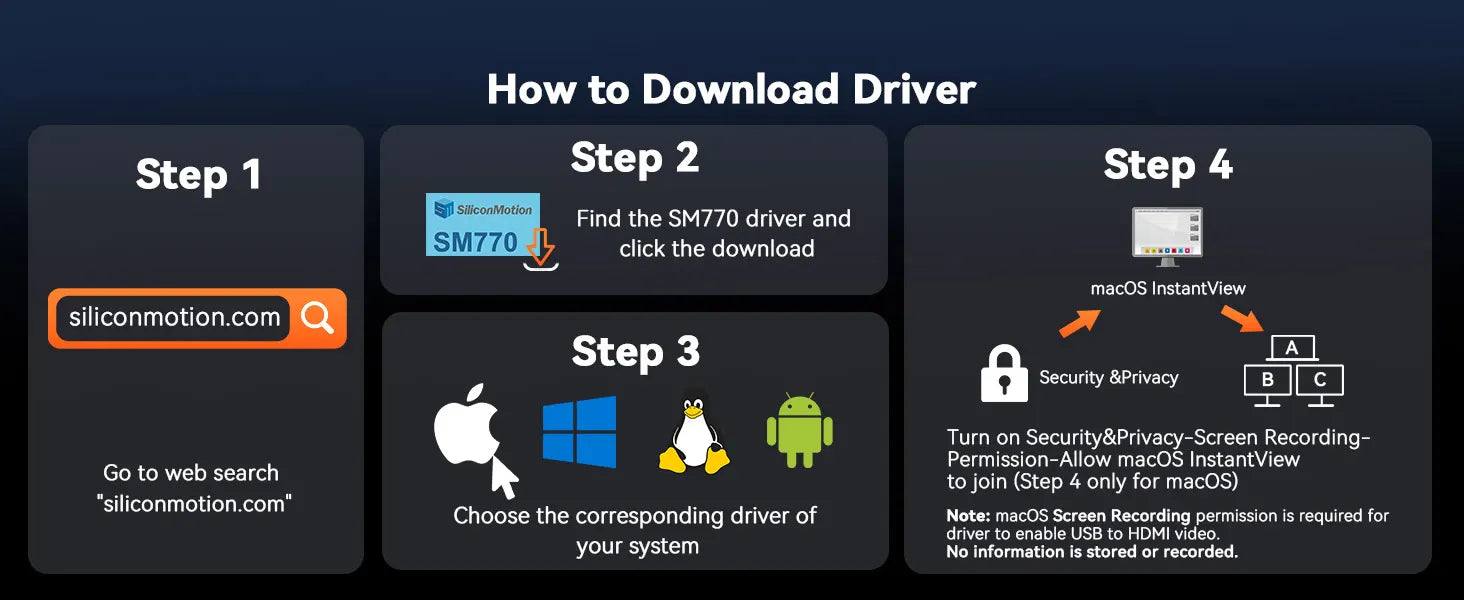3. MacOS Special Tips: Screen Recording: The driver necessitates screen recording permissions to capture pixels and transmit them to your external monitors. To grant this permission, navigate to Apple Menu -> System Preference -> Security & Privacy -> select the "Privacy" tab -> scroll to locate "Screen Recording" and check "macOS InstantView".