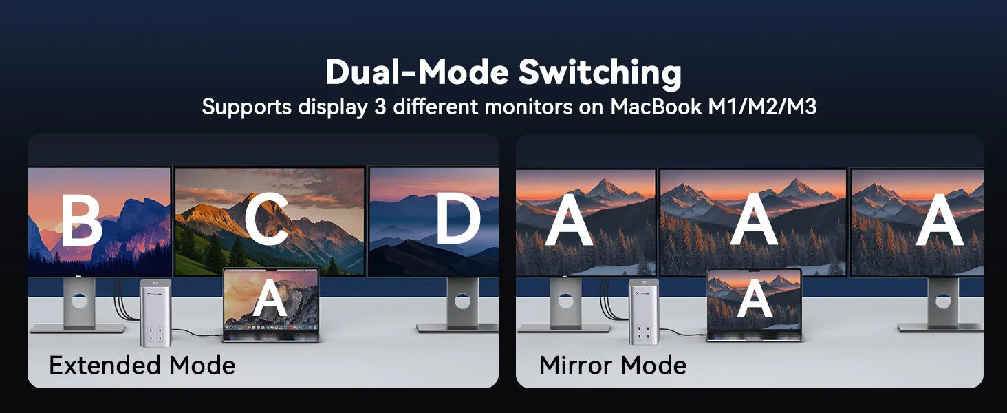 • Triple 4K@60Hz Display Expansion: TobenONE macbook pro docking station equipped with 3 HDMI + 2 DP ports, flexibly utilize any 3 of the 5 video output ports for 3 monitors expansion. Achieve ultra-clear 4K@60Hz resolution whether expanding to single, dual, or triple displays! Ideal for creators/developers, enabling Mac users to enjoy a smooth multi-screen workflow. Note: If all 5 video ports are connected, 2 monitors will not display.